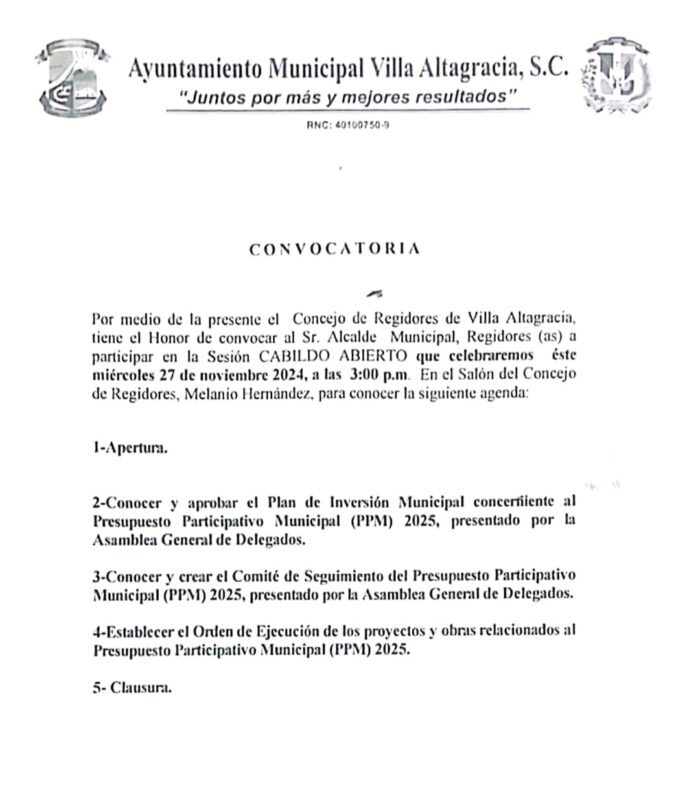 Por este medio, se le informa a la ciudadanía que este miércoles 27 de noviembre, a las 3:00 p.m., se llevara a cabo la sesión extraordinaria Cabildo Abierto en el salón de sesiones del Ayuntamiento Prof. Melanio Hernández, en la cual se trataran importantes temas relacionados con el Presupuesto Participativo Municipal 2025.